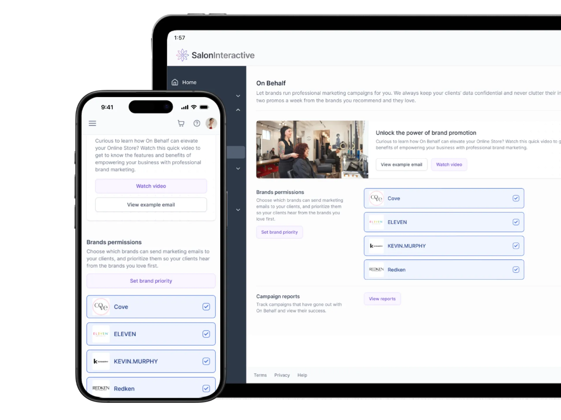On Behalf Marketing is an automated email marketing feature designed to boost service and retail sales for beauty businesses on SalonInteractive. This tool allows brands to send various types of email marketing directly on behalf of the beauty business, encouraging salon clients to book services and make purchases through the salon’s Online Store.